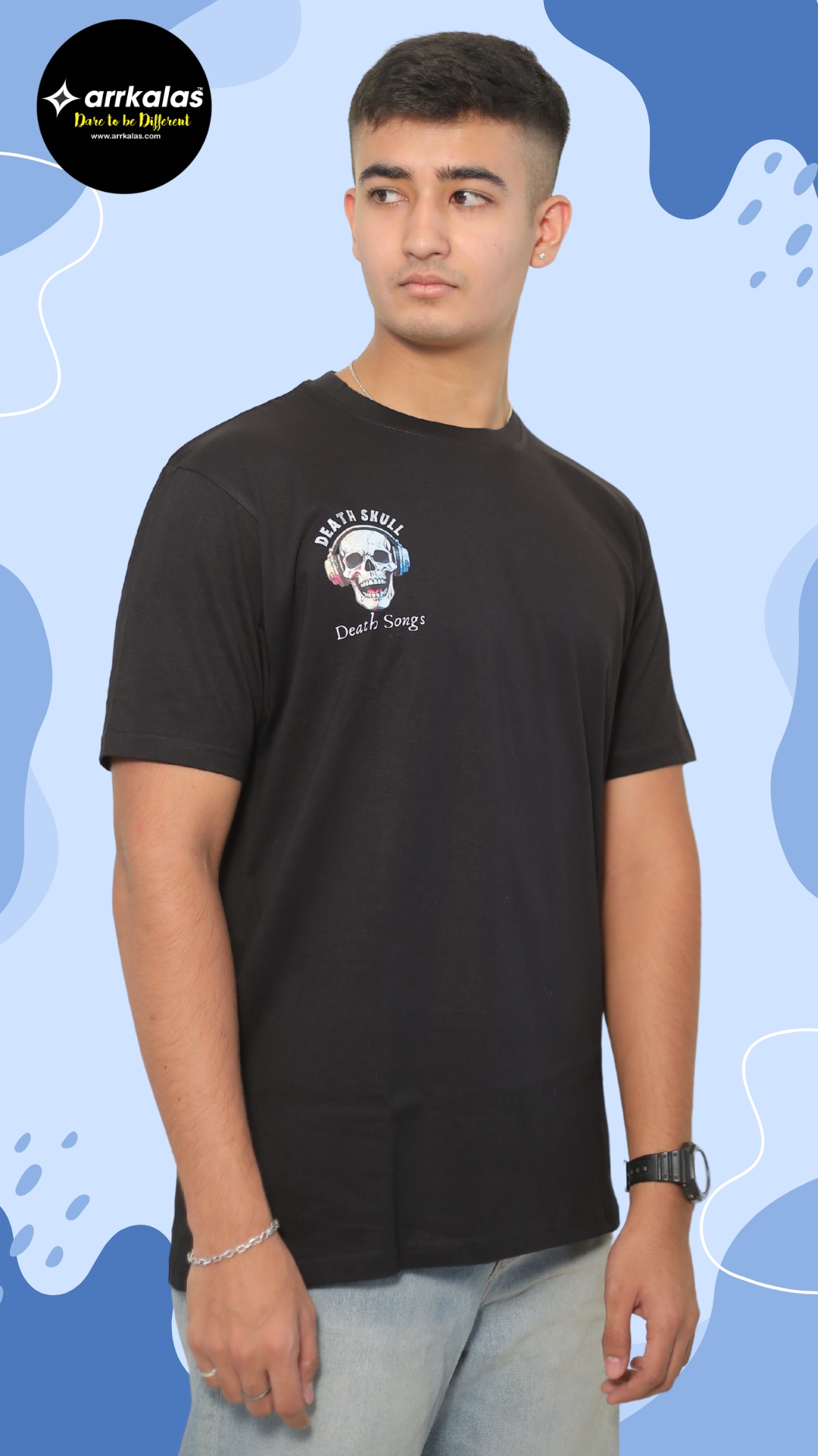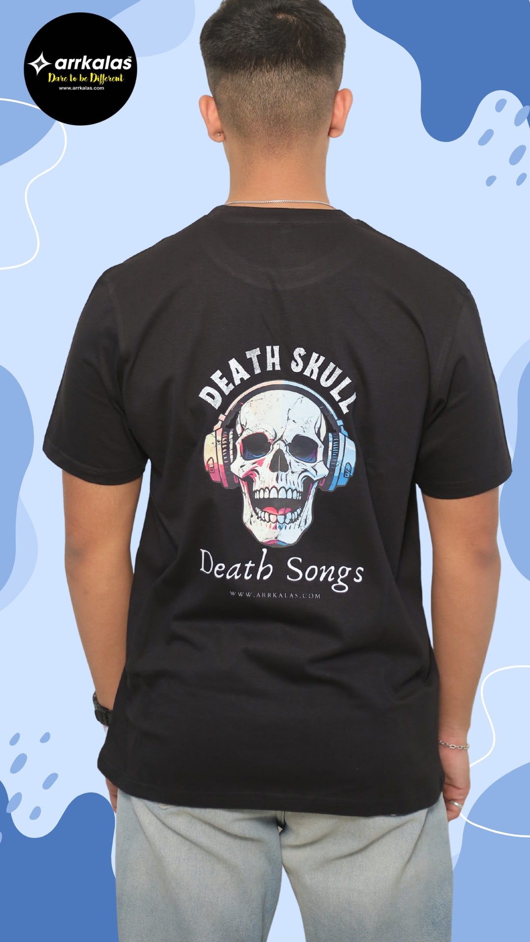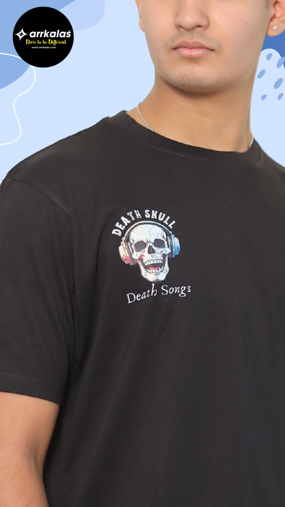 - Product Detail: DEATH SONGS SKULL – BLACK printed T-shirt, has a round neck, and short sleeves