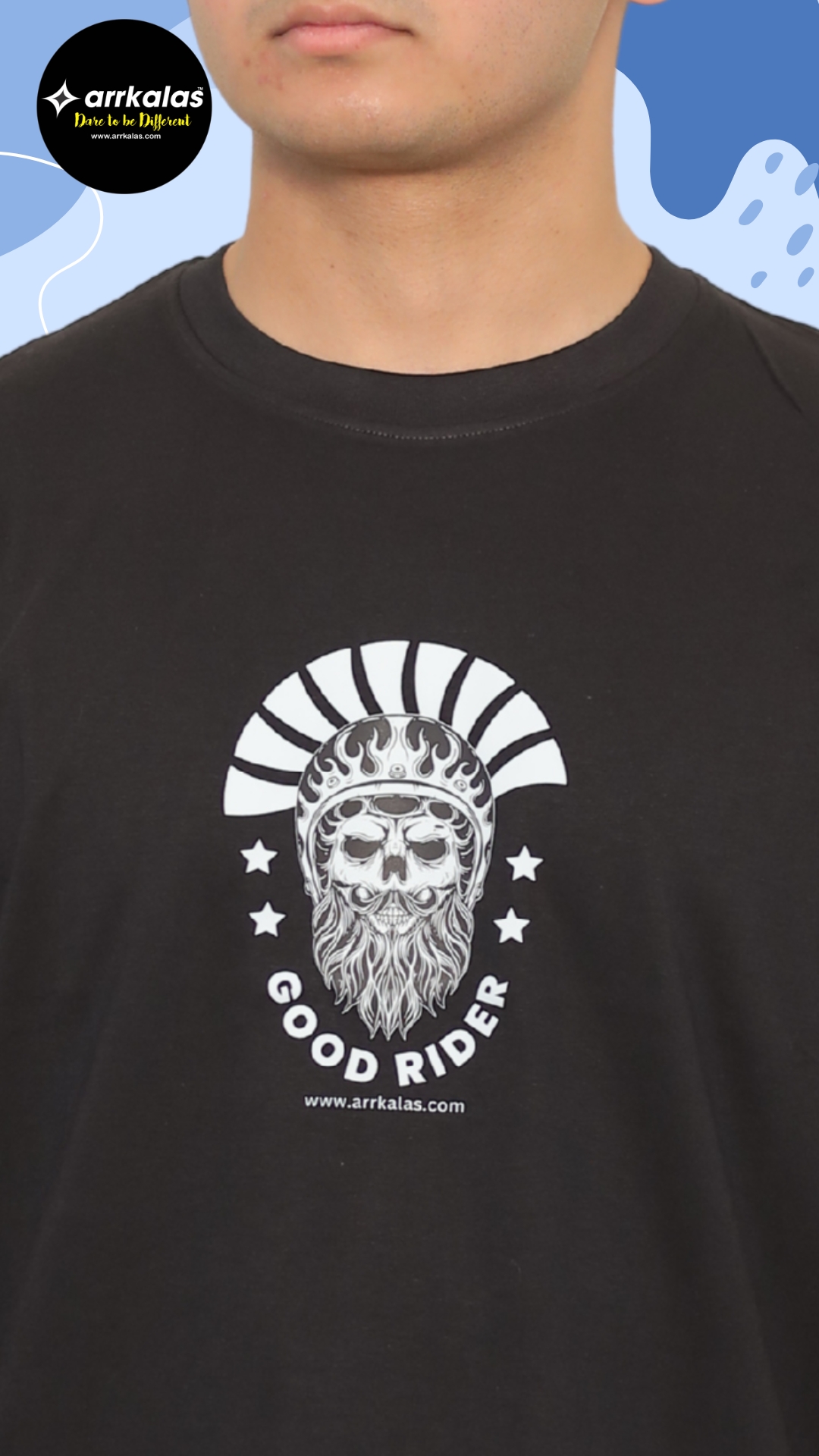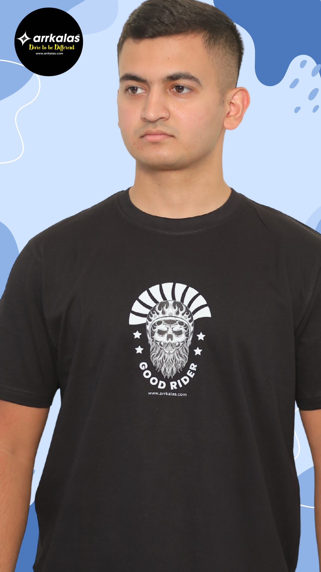 - Product Detail: GOOD RIDER SKULL- BLACK printed T-shirt, has a round neck, and short sleeves